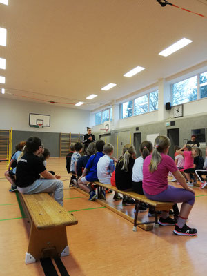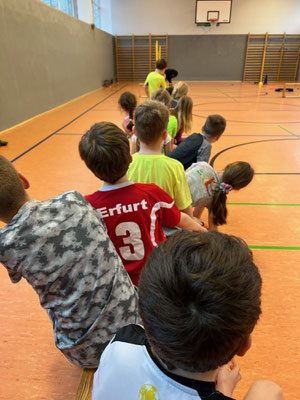 Zum Abschluss in der Turnhalle präsentierte nochmal jede Klassen ein besonders eindrückliches Erlebnis aus der Projektwoche. Alle Kinder zeigten zusammen ihre mutigen Superheldenposen.