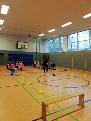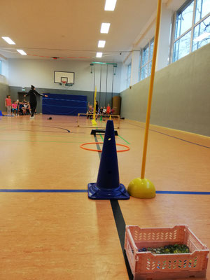 Los ging es in der Turnhalle, wo wir die gemeine Stressika und unsere Helfer, die Superheldenposen, kennengelernt haben.